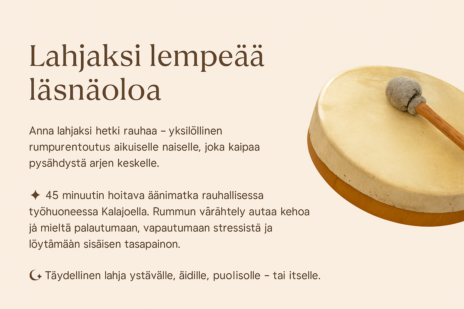 Rumpurentoutus on 45min pituinen hoitava äänimatka. Rummun värähtely auttaa sinua rentoutumaan, vapautumaan jännityksistä ja palauttaa yhteyden omaan sisimpään. Jokainen sessio on yksilöllinen ja ainutlaatuinen- juuri sinun tarpeisiisi laadittu.